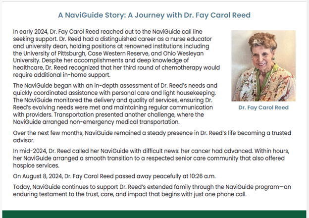 Below is a testimonial showing how one of United Church Homes’ NaviGuides assisted a client through this support process.
